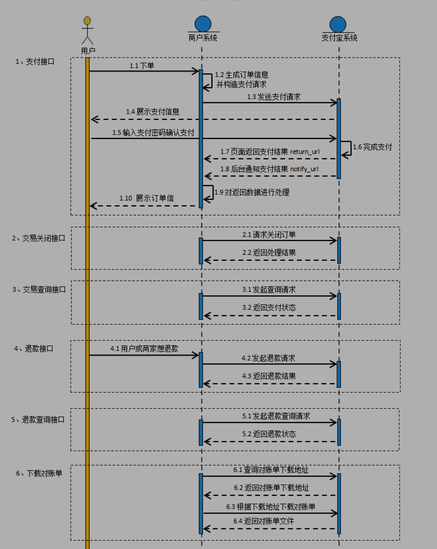 系统调用类:直接从服务端发起HTTP请求,支付宝会同步返回请求结果。例如本产品中的交易查询等配套API。